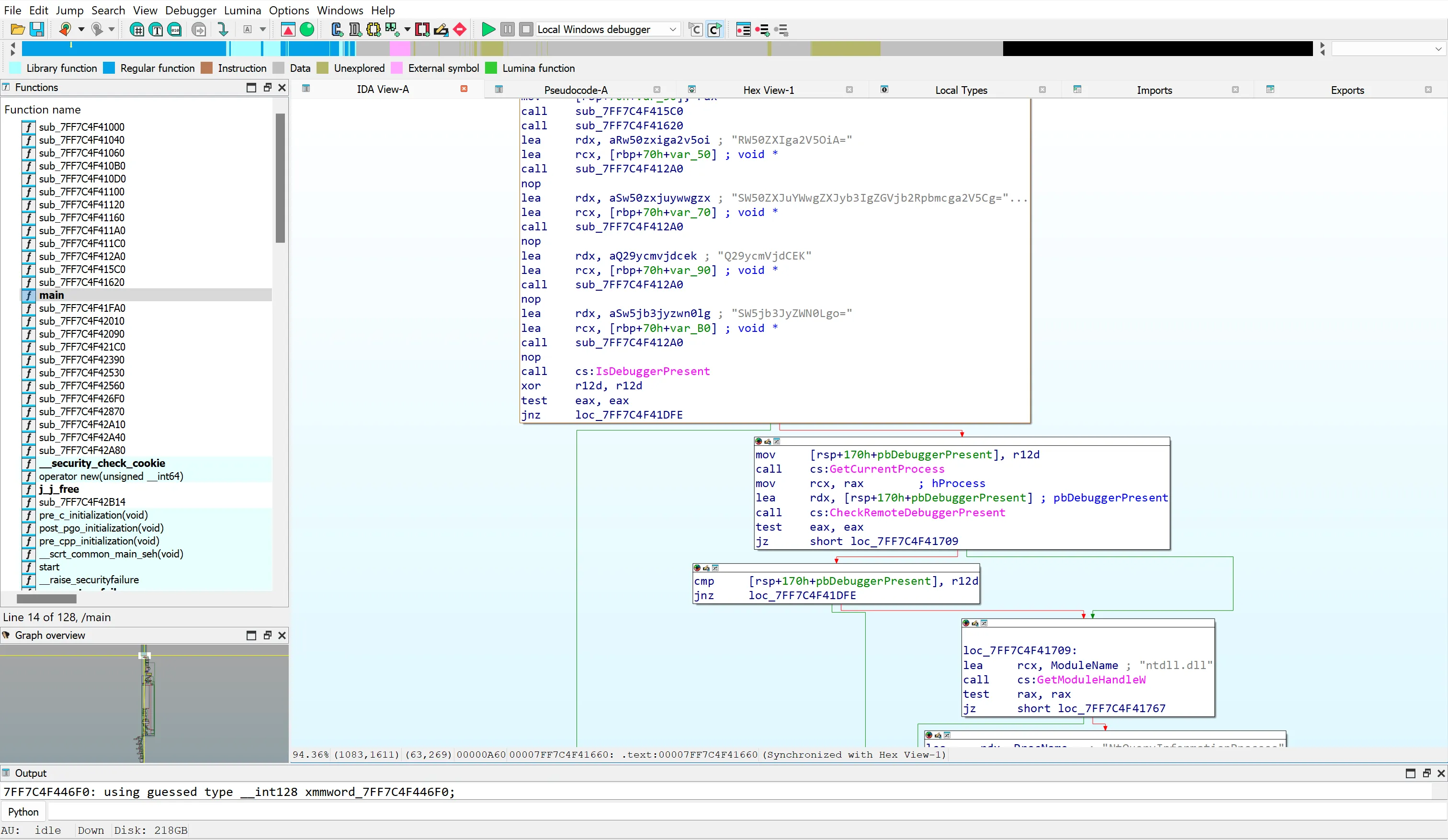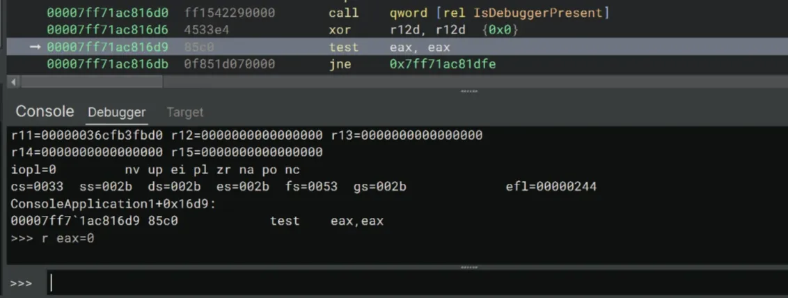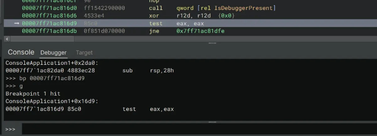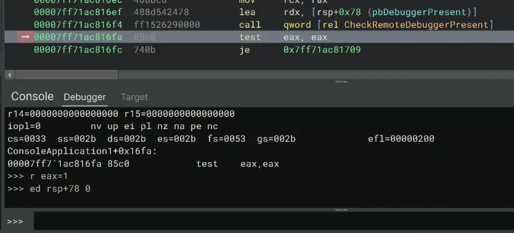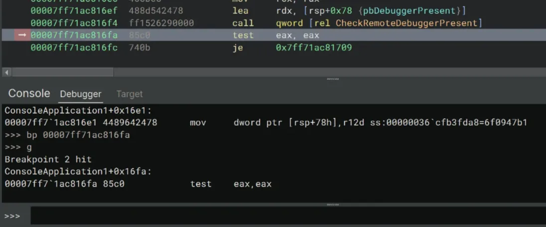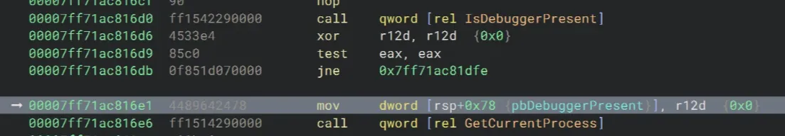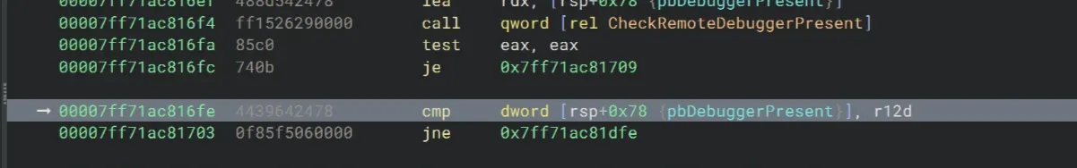 Once again, let’s set a breakpoint right after call qword [rel CheckRemoteDebuggerPresent]