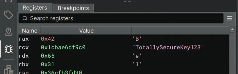 After skipping all the checks, we can definitely continue stepping the code. In the Registers pane, the key TotallySecureKey123