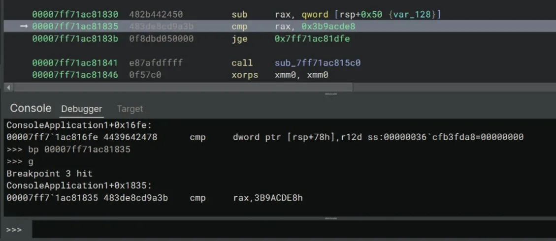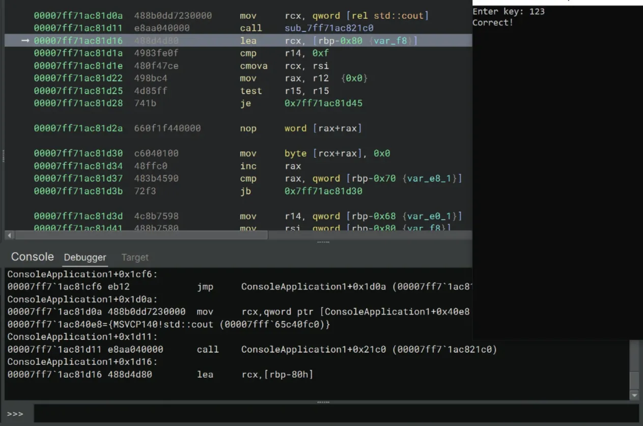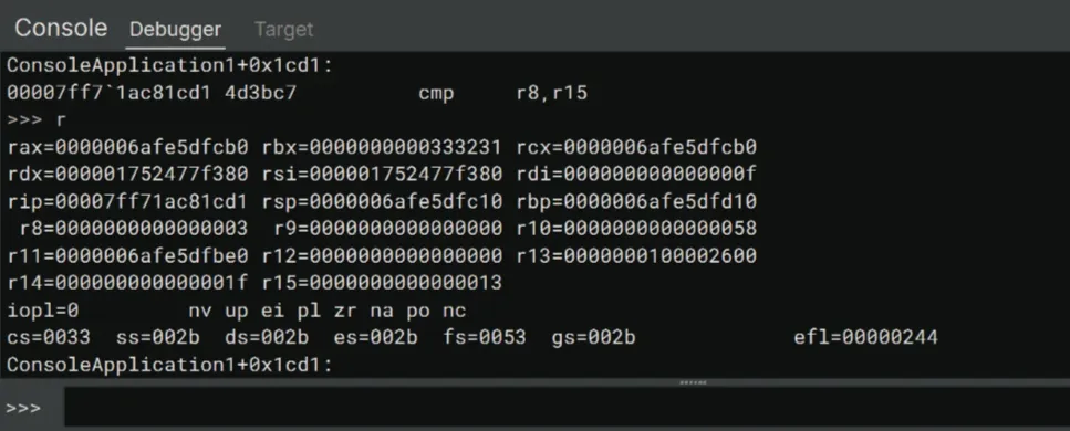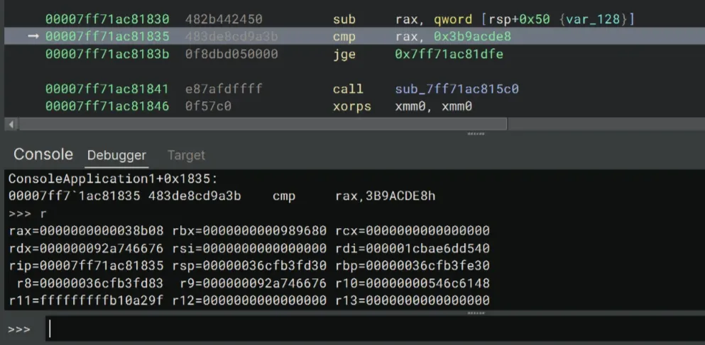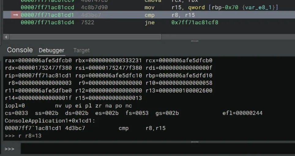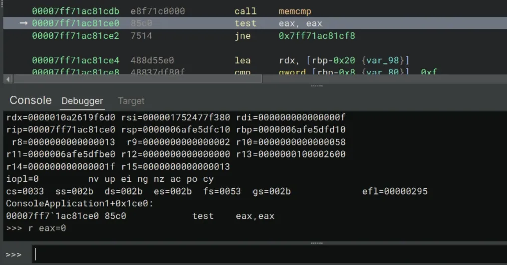 into the debugger console to view the value of the registers. Notice that the program compares rax