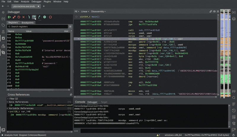 I’m still not sure if I’m using the debugger the right way though, it seems to me that I’m not taking full advantage of the debugger interface in Binary Ninja though. If anyone appears to read this post and know how to use the debugger properly, leave a comment to give me some tips!