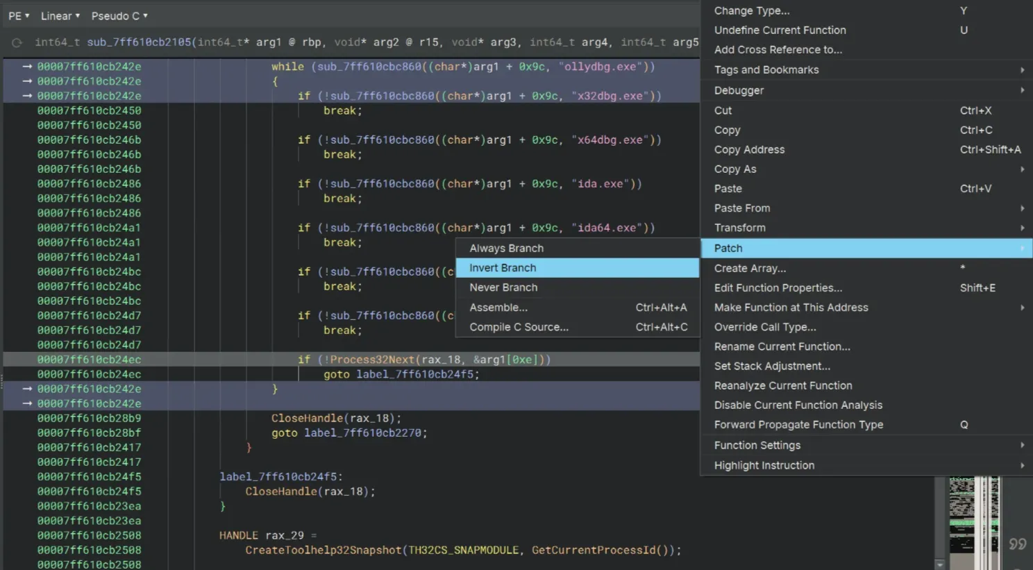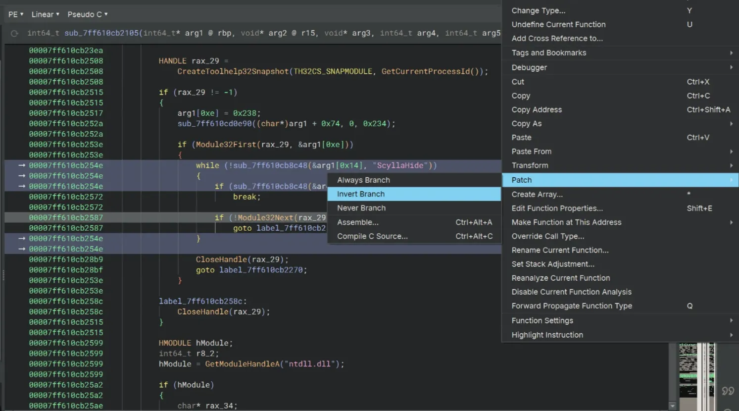 Our next obstacle is the ScyllaHide check. We use Patch → Invert Branch once again at the if statement for Module32Next to get around this.