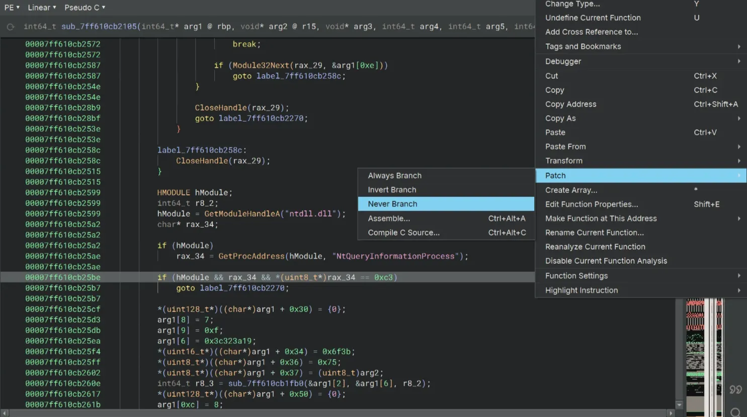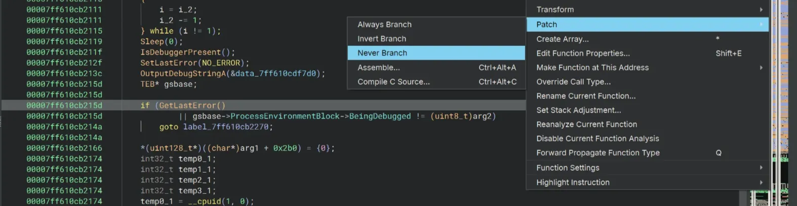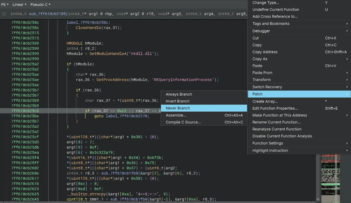 To bypass some NtQueryInformationProcess things, we’ll use Patch → Never Branch on the if rax_37 == 0xc3 || rax_37 == 0xe9 statement.