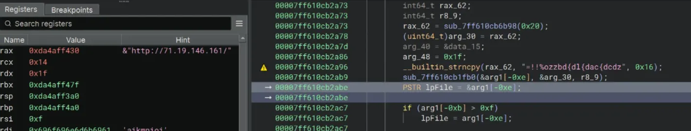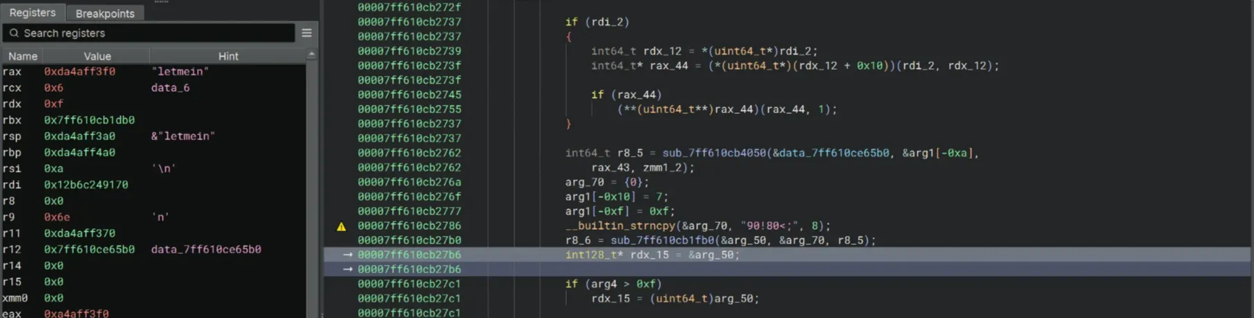 Then we can see the sub_7ff610cb1fb0 once again. I checked the Register pane and the string letmein appeared. Is this another password? I don’t know.