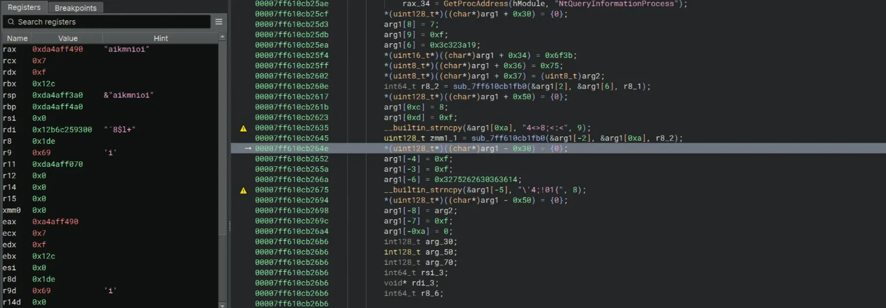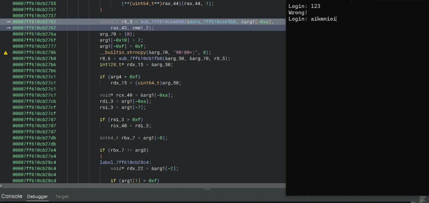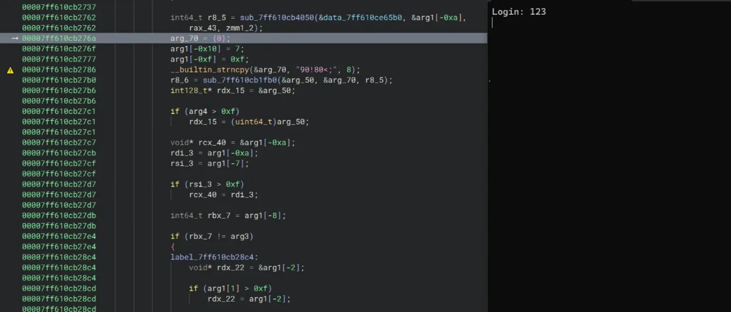 Also I noticed the sub_7ff610cb1fb0 function. It seems to me that this is the one that does the key decoding. Before the call to sub_7ff610cb1fb0, there is a strncpy function that copies 4<>8;<:< into &arg1[0xa], and &arg1[0xa] is fed into sub_7ff610cb1fb0. Looking at the patterns and comparing the length of this string with aikmnioi, this is probably the encrypted string for aikmnioi.