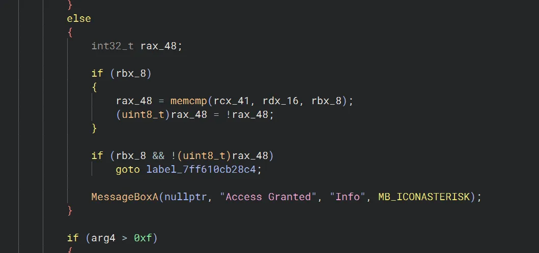 Scrolling down a little bit, we can see a MessageBox with the message Access granted. Therefore the logic for checking the key is definitely located near here.
