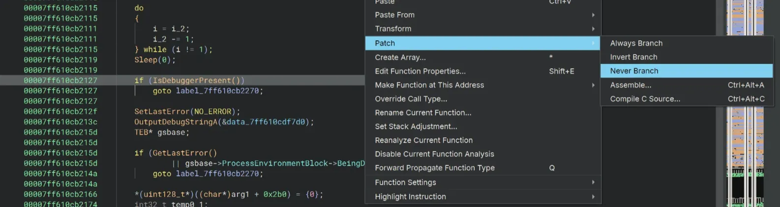 Let’s bypass the debugger check first. For this IsDebuggerPresent(), I’m going to just simply use Patch → Never Branch.