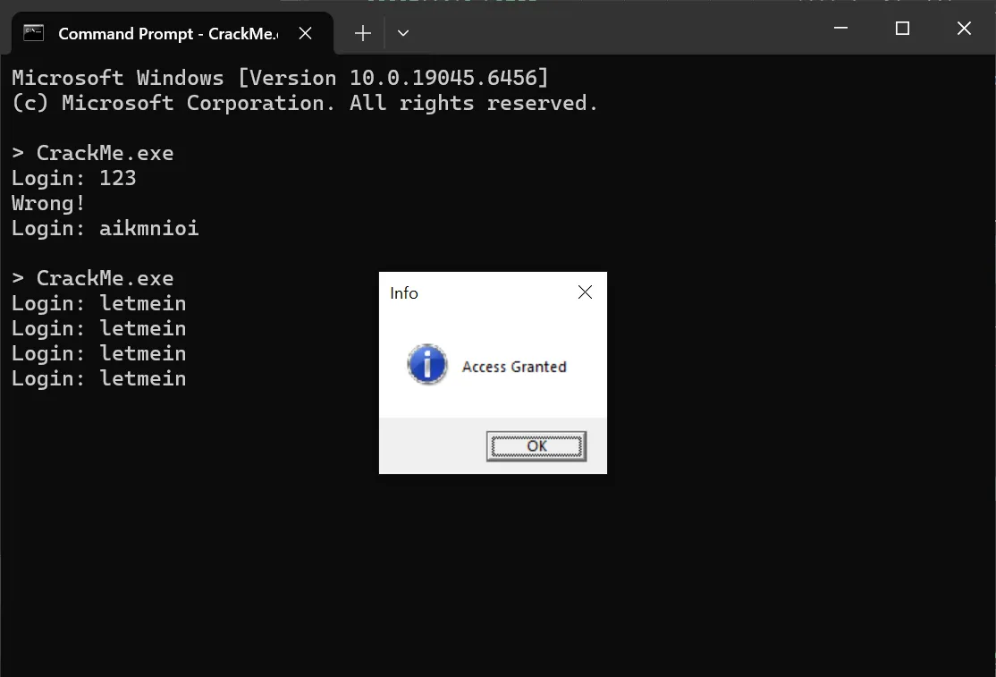 Typing letmein into the crackme just made a message box to show up, but this time it’s not an error message box. However, no website was opened, and the crackme just repeatedly ask for the key without exiting. It’s funny that the author included a second key but it just doesn’t work.