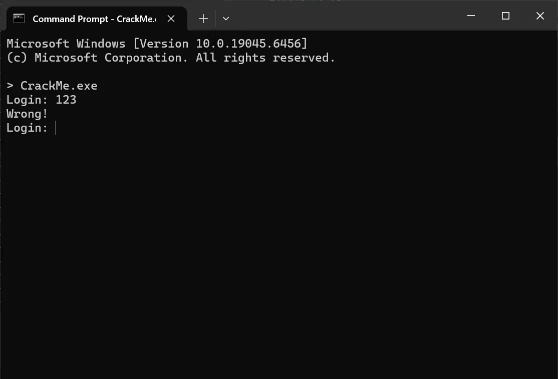 Since I typed the password 123 into the debugging crackme earlier, I let it continue running until it prints Wrong! and prompts me to enter another key.