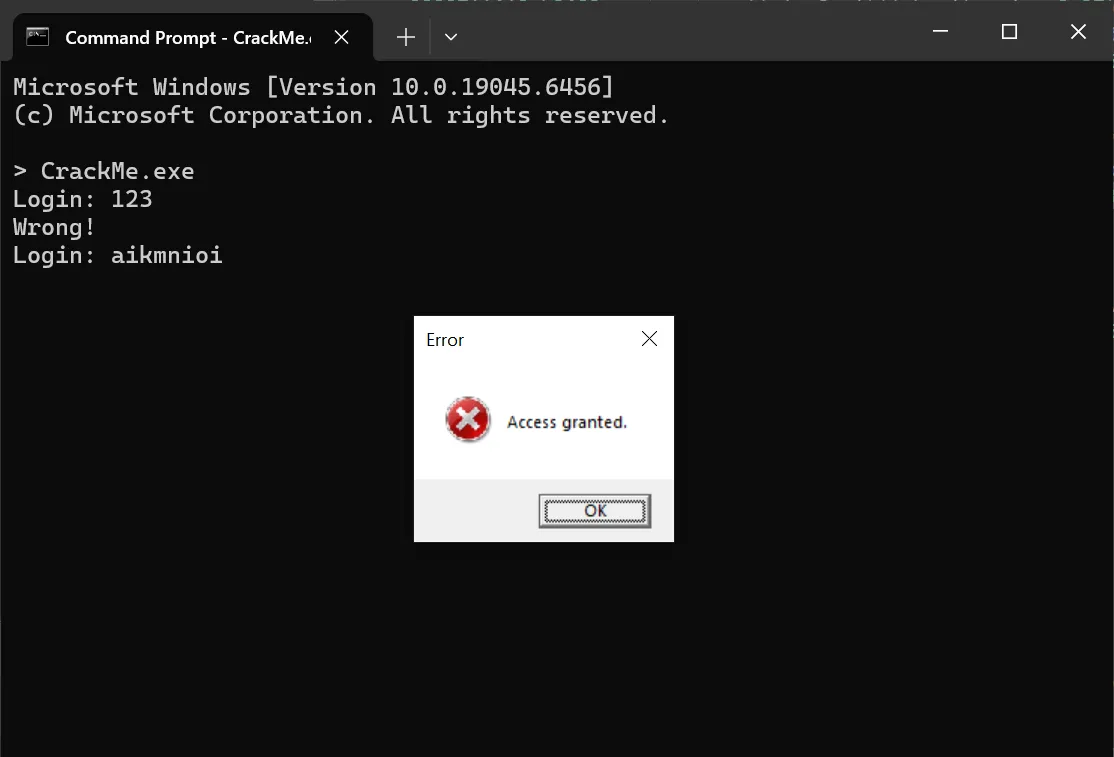 After plugging the string into the crackme, it showed an error MessageBox, however the message shown was Access granted.. Then my browser popped up to a website at an IP address. I guess the error sign of the message box is just a decoy, and aikmnioi is indeed the correct key.