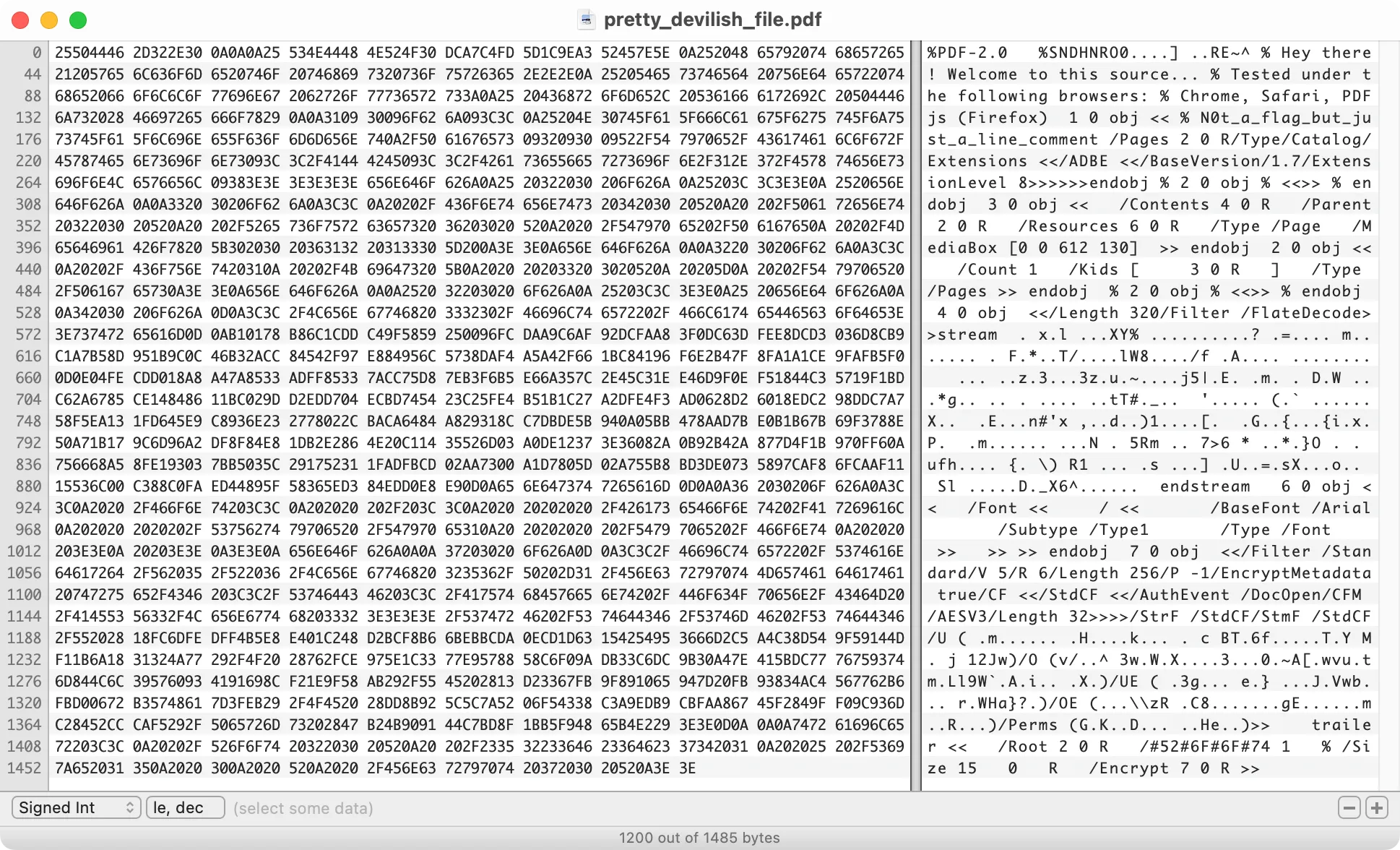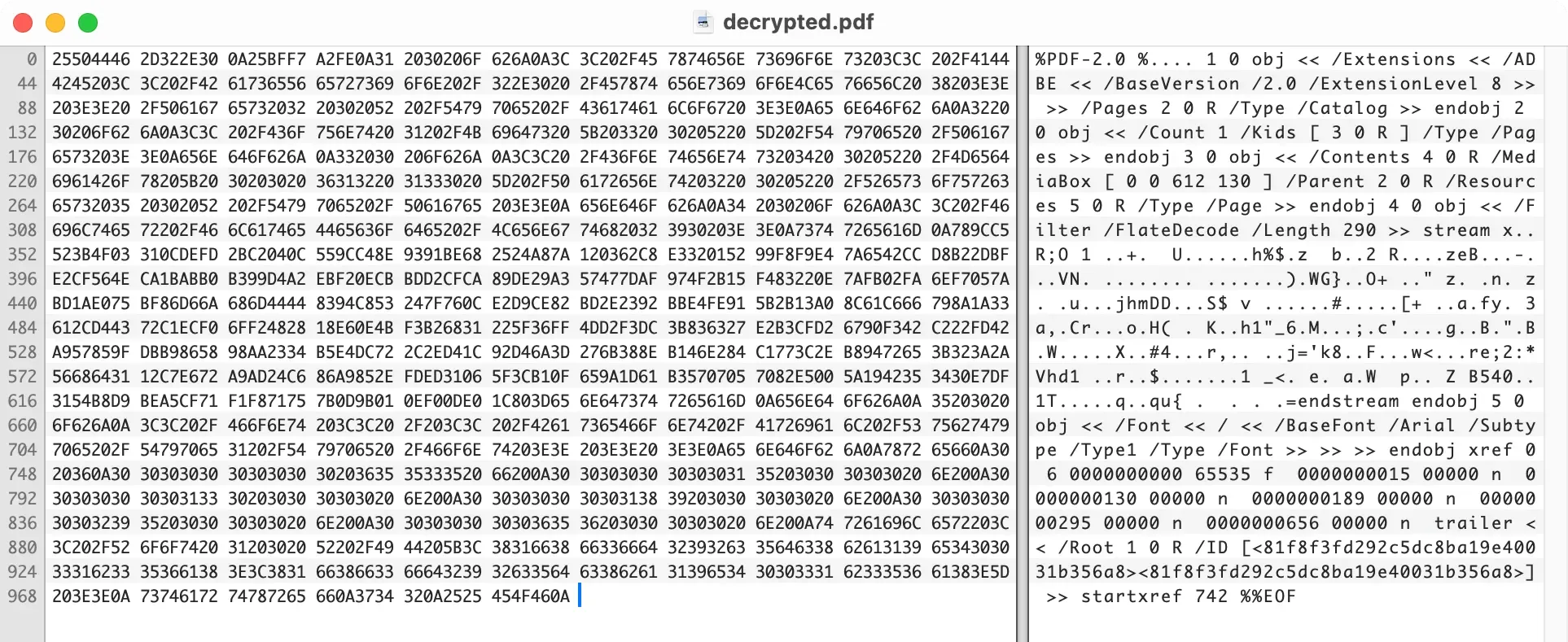Once again, dumping the decrypted PDF into a hex editor didn’t yield anything interesting sadly.