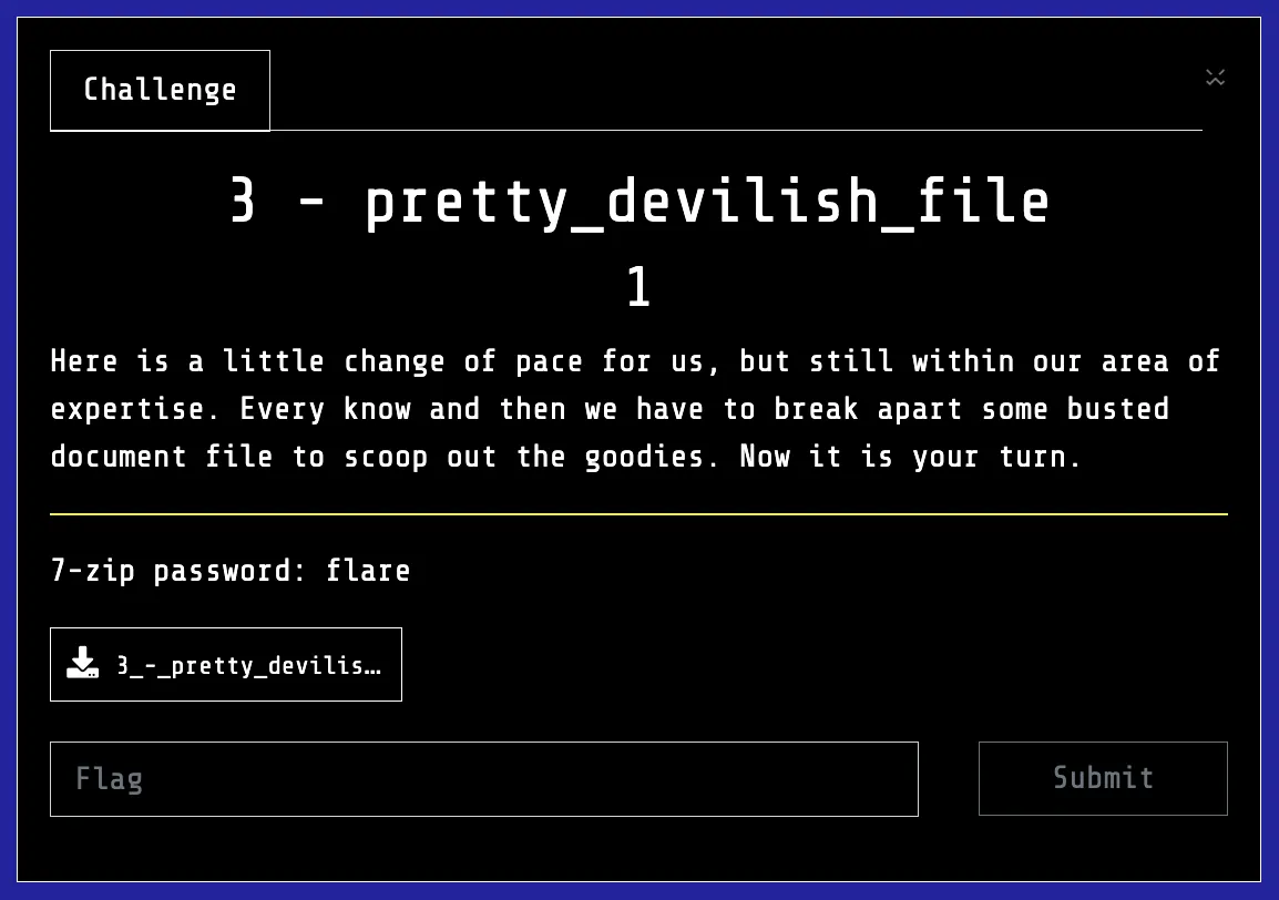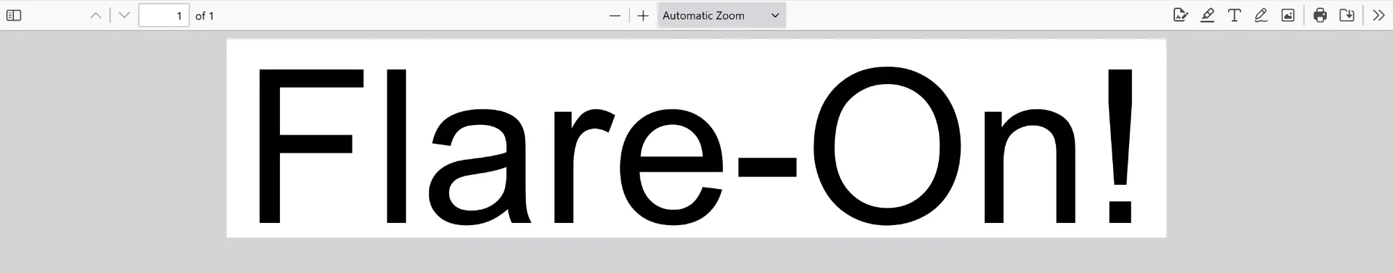 qpdf: operation succeeded with warnings; resulting file may have some problemsLuckily, qpdf outputs a usable PDF file without a password (wait, is this PDF really encrypted?). Opening the file just says “Flare-On!”, so there’s nothing interesting here.
