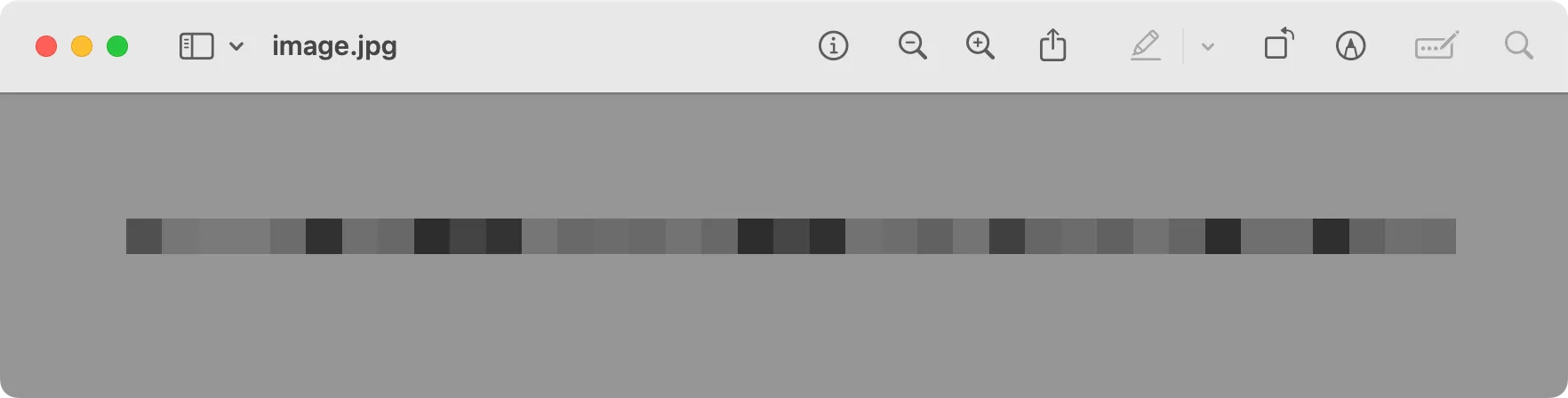 $ echo "ffd8ffe000104a46494600010100000100010000ffdb00430001010101010101010101010101010101010101010101010101010101010101010101010101010101010101010101010101010101010101010101010101010101ffc0000b080001002501011100ffc40017000100030000000000000000000000000006040708ffc400241000000209050100000000000000000000000702050608353776b6b7030436747577ffda0008010100003f00c54d3401dcbbfb9c38db8a7dd265a2159e9d945a086407383aabd52e5034c274e57179ef3bcdfca50f0af80aff00e986c64568c7ffd9" | xxd -r -p > image.jpgAnd… okay, it’s a 37x1 grayscale image, is the flag hidden somewhere here?