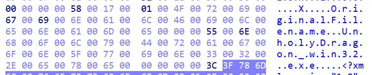 At this point I guess the executable just clones itself and changes exactly one byte of the new file upon launching. Wait, the original binary has the first byte of the PE header changed. Maybe it is a self-modified clone as well. So if we have UnholyDragon-150.exe, we should have UnholyDragon-149.exe, right?