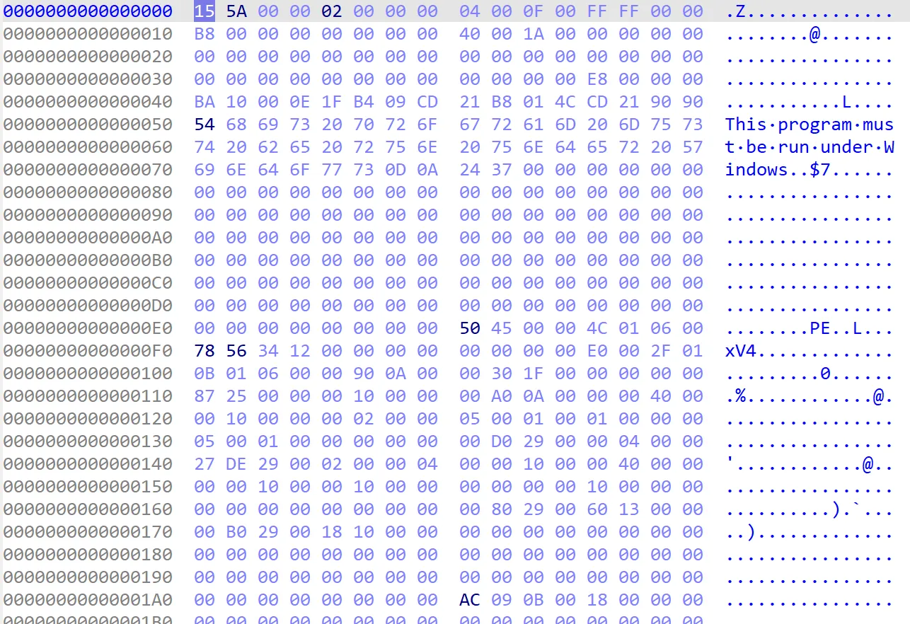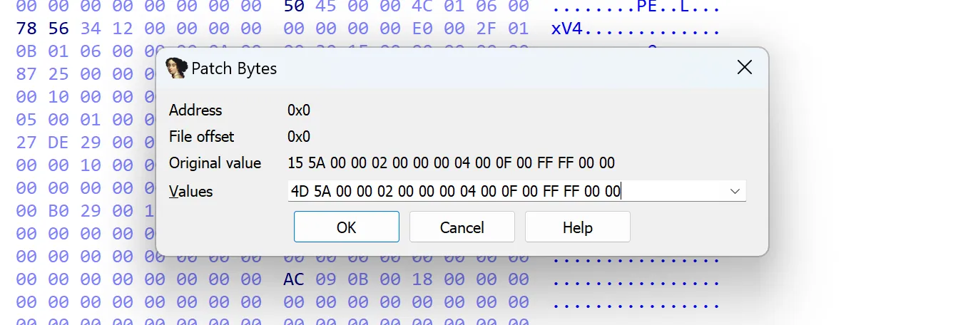 After poking around a bit inside IDA, I still couldn’t get an idea what this program was supposed to do! At one point I switched to Hex View and noticed that the magic number of the PE executable is corrupted. The first byte of the header was 0x15 instead of 0x4D.