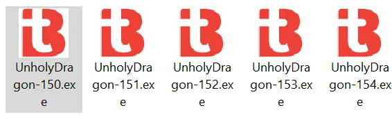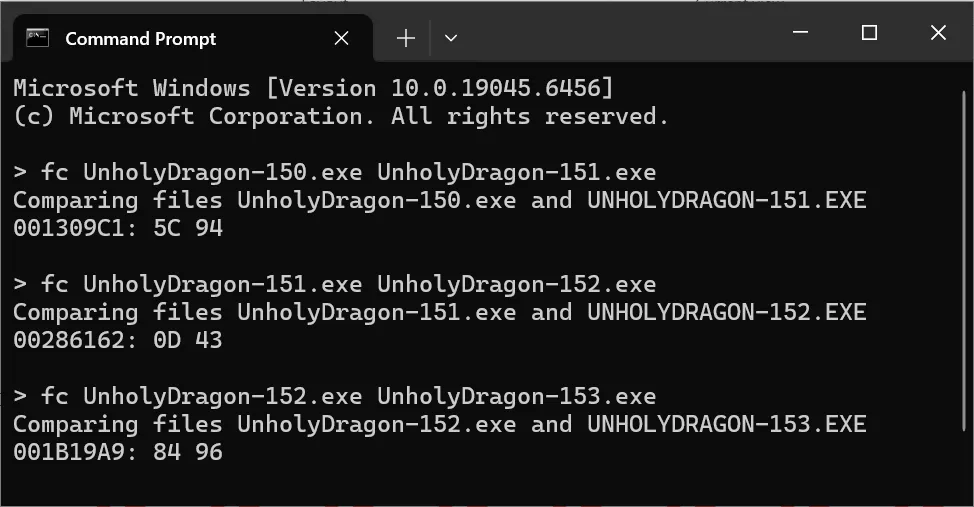 I was too lazy to patch it again this time. Knowing that the one byte that changed was the header’s magic number and patching it would create a binary identical to UnholyDragon-149.exe. So I just delete the corrupted PE, duplicate UnholyDragon-149.exe and rename it to UnholyDragon-150.exe.