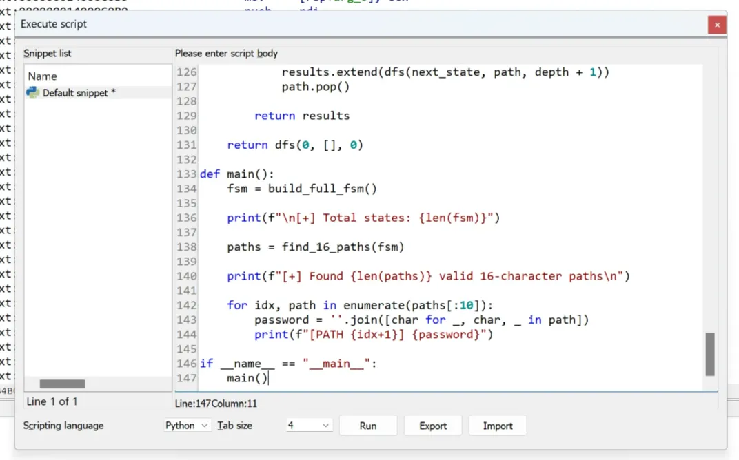 main()I’m going to head to IDA and go to File → Script command. Paste the script into the editor, remember to set the Scripting language to Python, and click Run.