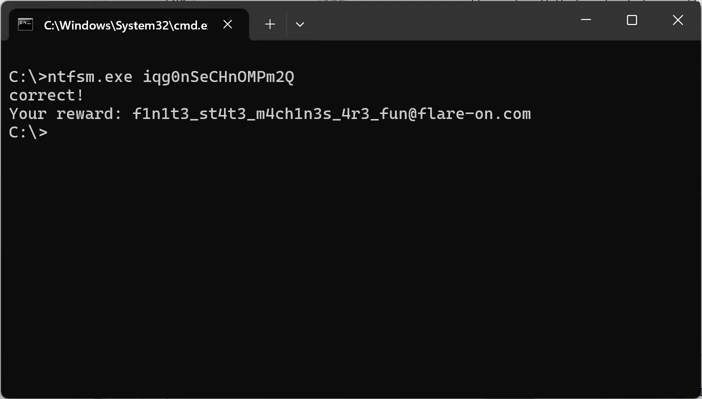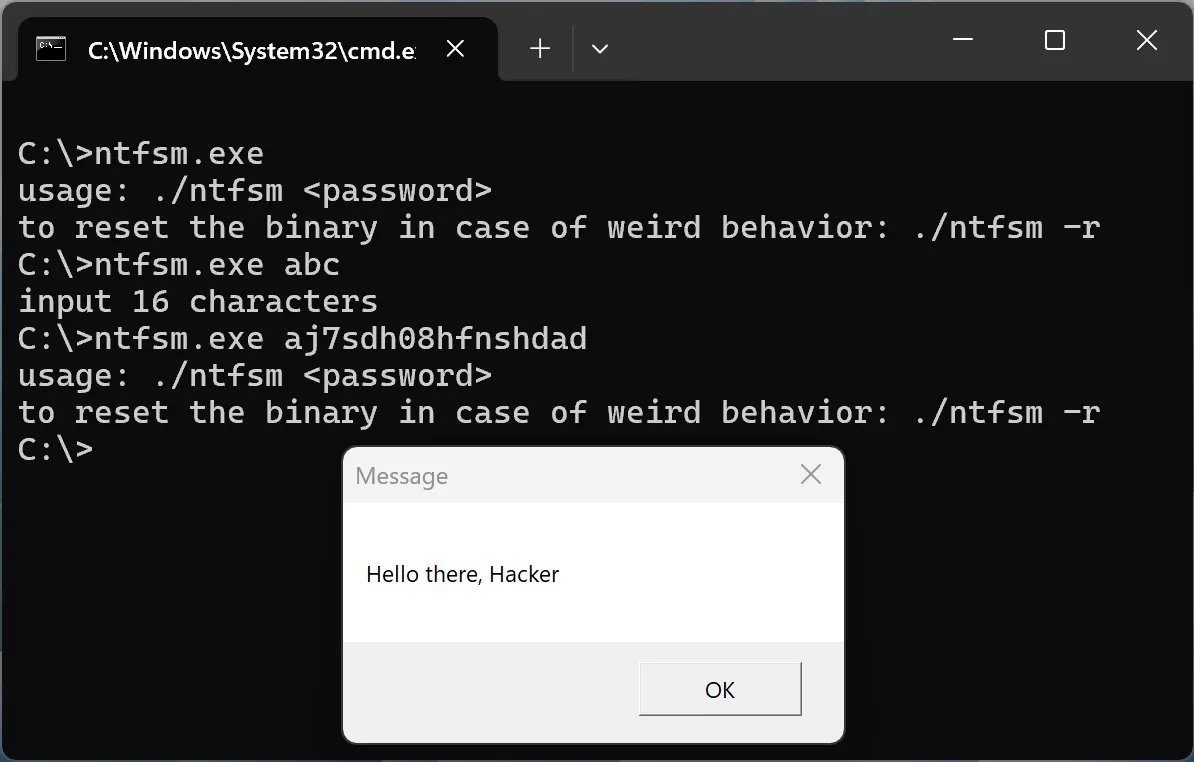 The challenge gives us a Windows executable file called ntfsm.exe, which asks for a 16-character password as an argument. I tried with a random 16-character password and it yielded a message box.