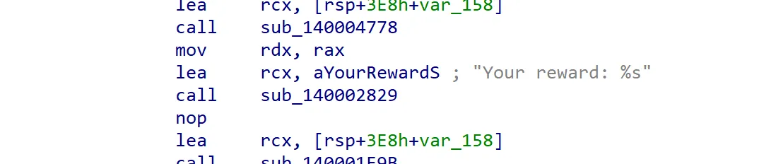 At the end of sub_14000C0B0, seems like the correct password is used to create a SHA-256 hash. This hash is then used as the key to AES-decrypt some blob. The decrypted text is likely to be our flag, which gets printed out as Your reward: %s.