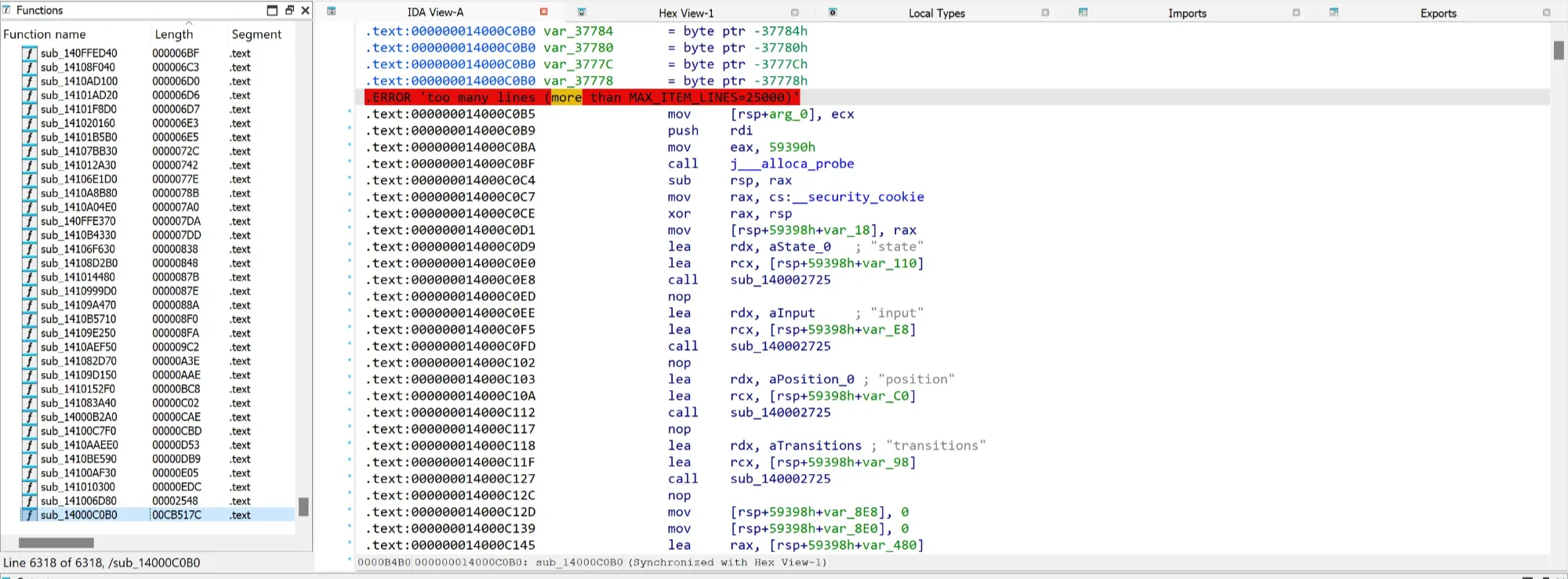 Opening the executable file in IDA is painfully slow. Sorting the functions by length reveals sub_14000C0B0 of approximately 833 KB in size, which is unusually large for a function. This function appears to be implementing a finite state machine (that’s probably what fsm in ntfsm stands for) for validating an input password.
