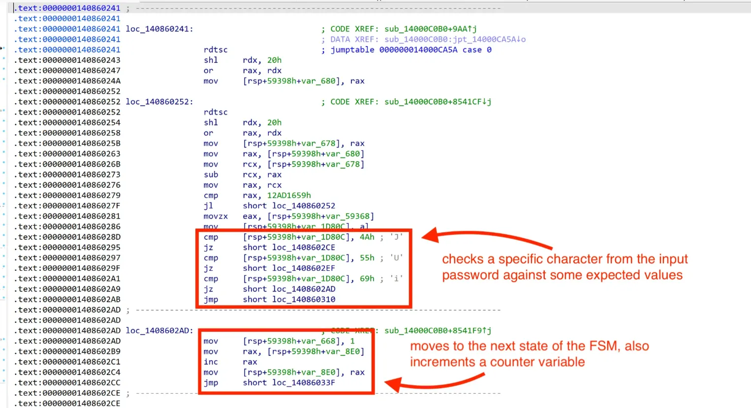 Let’s poke around some cases of the jump table! Looking at case 0 at loc_140860241, each case must be a state of the FSM, which checks a specific character from the input password against some expected values, and finally moves to the next states of the FSM accordingly. So the FSM is stored as a giant switch statement with one case per state.