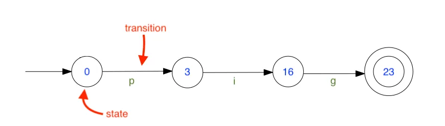 I’m going to simplify this term a little bit. This is probably the simplest illustration of a FSM that I have. With an FSM we’ll start at a state (numbered as 0, 1, 2, etc), transition (marked as an arbitrary character) to the next state, and stop at the deepest state.