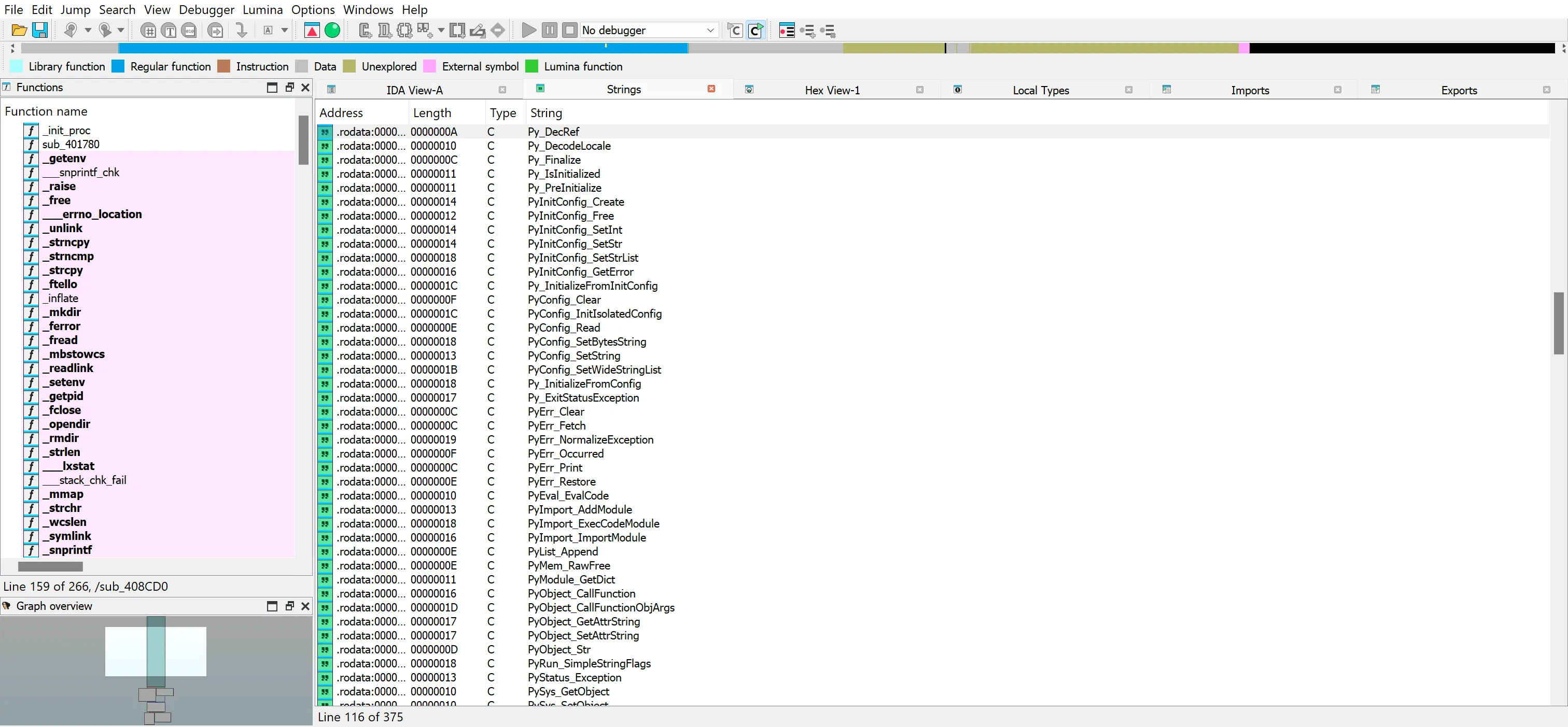 After opening the binary in IDA and digging through a bunch of functions, I was still lost. Then I checked the Strings view and noticed a lot of strings starting with py...