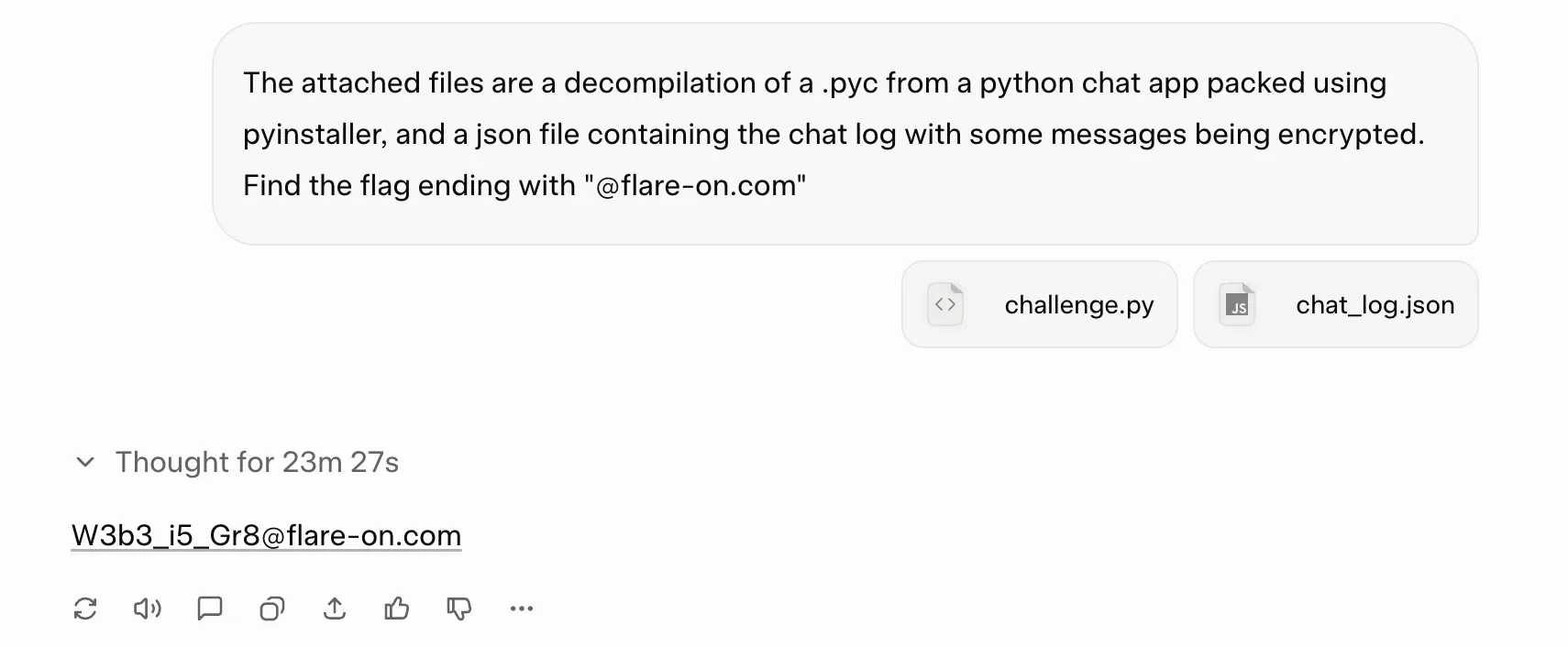 I did try solving the challenge by tossing the decompilation and the chat log file into Grok LOL, since I heard someone said that LLMs are powerful at solving cryptography challenges. And Grok nailed this with just one shot!